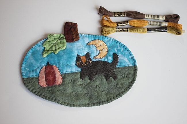 - Tallo de la calabaza – puntadas de quilting y puntadas largas para hacer una X