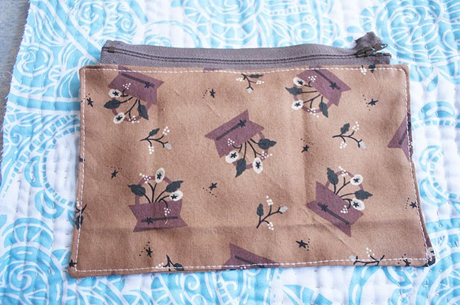 Con hilo al color del zipper y a mano, cosiendo solamente en la guata, cose el zipper al bolso.
