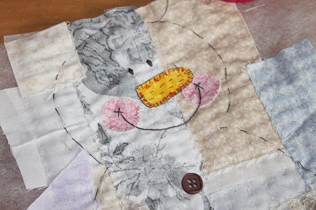 Una vez que ya tengas hechos los dos cuadros o bloques del patchwork, vamos a bordar la cara del muñeco en uno.